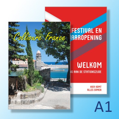 A1 posters, op 90 of 120 grams mat gecoat papier.
