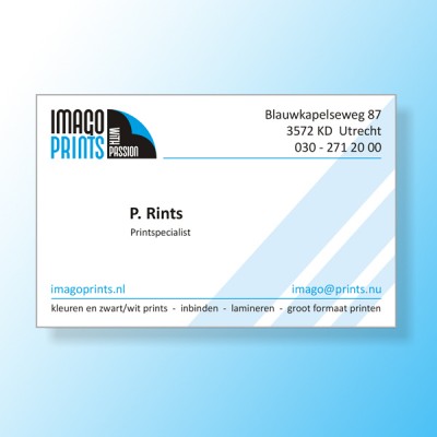 Visitekaartjes 85x55mm (standaard) of 90x50mm. Keuze uit visitekaartjes met rechte hoeken (standaard) of met 1 of meerdere ronde hoeken.